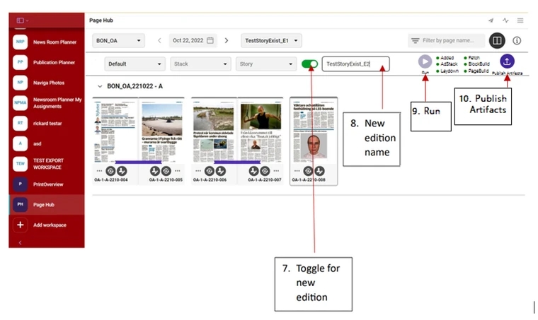 4. Publish Artifacts - This button is enabled when a Run is successful. On clicking this button the artifacts are published onto a predefined destination (configured through Publisher software). Note: From Page Hub Version 4.2.0 the Publish artifacts (export) settings are configurable from Page Hub settings under Export tab. 1. All editions that were run before Page Hub Version 4.2.0 if their pages need to be exported again from Page Hub Version 4.2.0 then make sure the run is executed again and file naming conventions are not updated in latest run (should be same as old edition) 2. Export configuration needs to be done before using Publish Artifacts after upgrading, since this the old export functionality is no longer supported.
