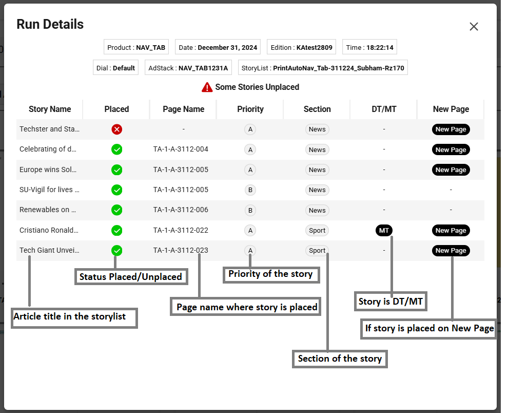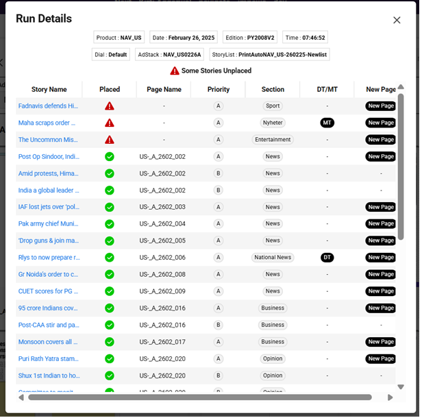 Run Details in Pagehub provides a concise summary of the executed run. This enhancement enables user to quickly view the placement status of stories. This determines whether any story included in a storylist is placed on a page after execution. Additionally, the run details will offer key article details at a glance—such as whether the article is DT or MT, if it’s a new page, its priority level, and more.