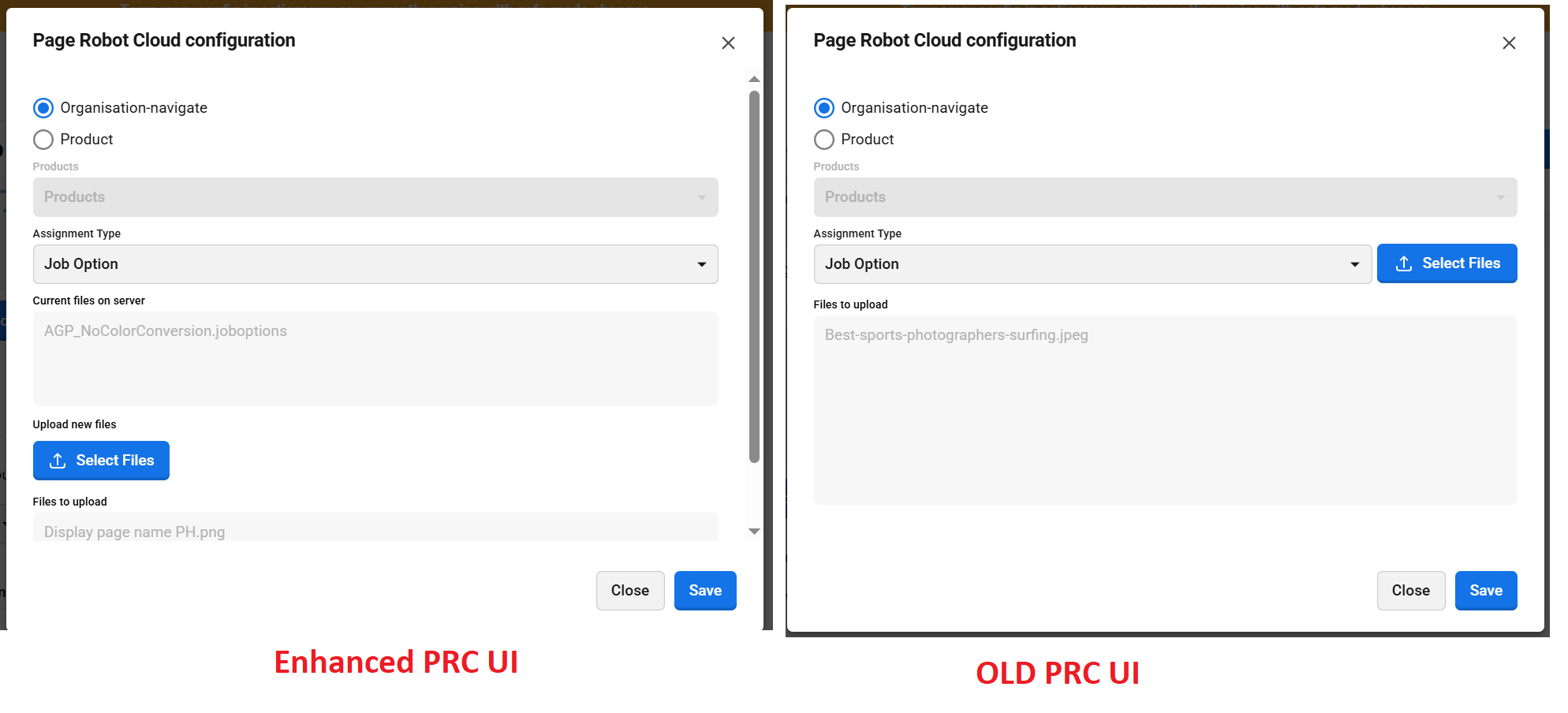 UI enhancements on “PageRobot Cloud config” dialogue box in Page hub configuration. In the new UI, the currently available files on the server will be displayed based on the selected organization or product.