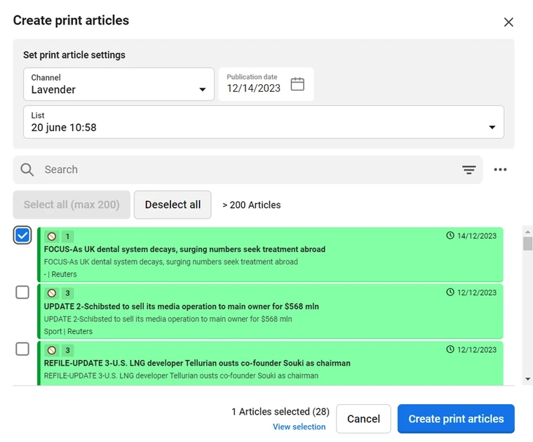 b. Publication date (for the target print articles) c. List (to attach print copies to, the list needs to be created before copying) d. Search articles to be copied and whos print copies will be added to the list, selected above e. Create print copies of the selected articles and add to the selected list