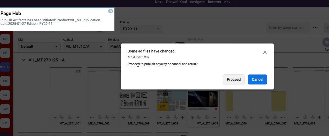 When a user selects one or more pages—either individually or using Select All within an edition—and clicks publish artifacts, a notification popup appears indicating that updated ad files have been detected.