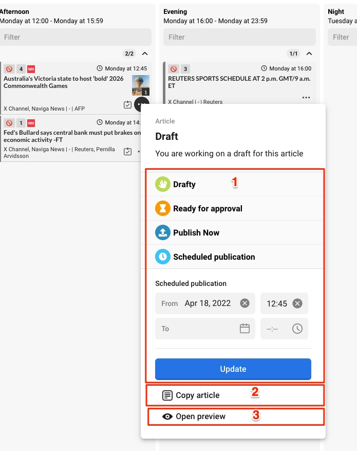 On the article card you see three dots. When you click here, you will be able to reach some functions related to the specific article. Which functions you see in your environment is depending on which configuration and permissions you have.