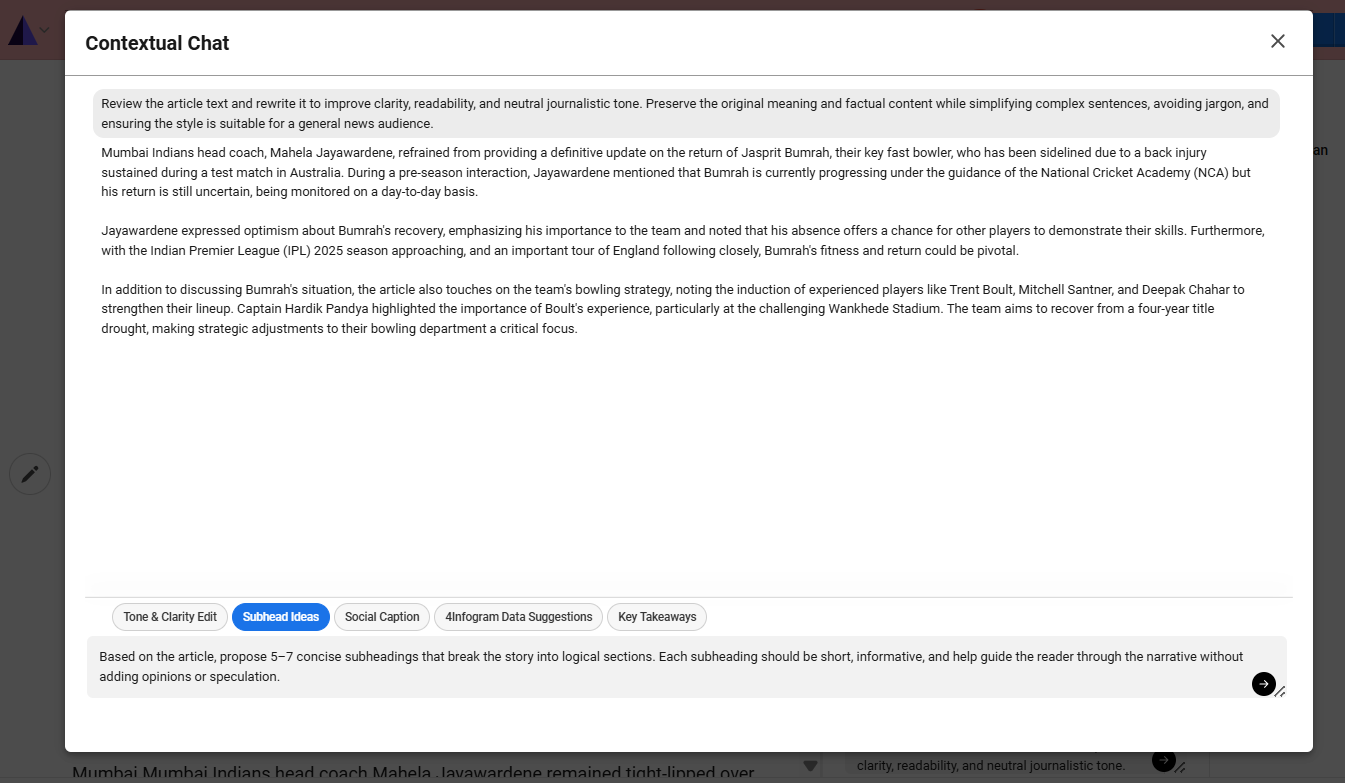 In version 3.3.0, Wingman contextual chat now has full visibility into all article content, ensuring generated output remains contextual and relevant. This includes support for key elements such as preambles, original headlines, and structured components like tables, teasers, and factboxes for accurate headline generation and data extraction.