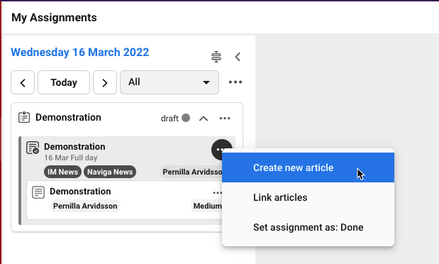 If the assignment already is created, you can click on the three dot on the assignment to create a new article.