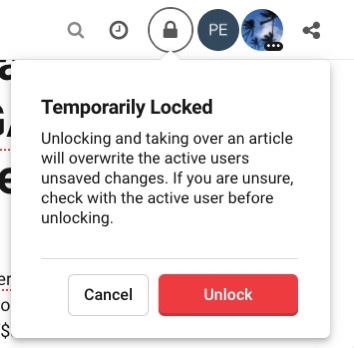 If the article is unsaved, the article is locked to anybody else. In the example below you see that user who is editing the article have three dots under the avatar (1) and there is a locked symbol (2). It is aslo visualizes who the other user is, that has the article open (3).