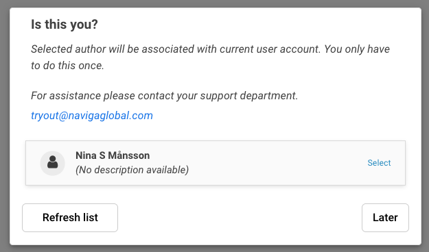 If, the optional property is unset or set to false, the user can not continue if the author-concept is missing or can not be found in the list in the dialog. When it is set totrueyou get the Later button to proceed as described above.