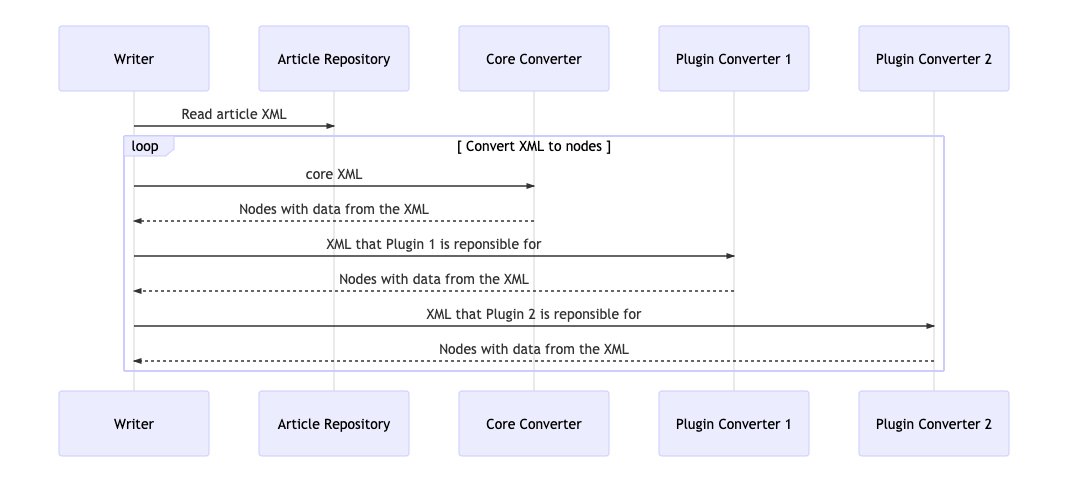 The process of converting to/from nodes and XML is done by Writer, but it takes help from one or many converters. Example of plugins that provide converters are plugins that contribute content to the article text, or add metadata information about the article.