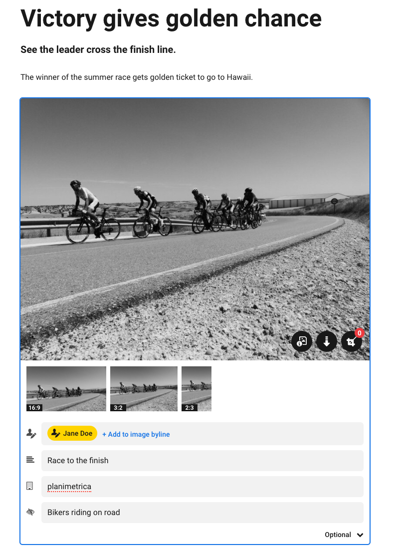 As a user you drag-and-drop images to your article, the Writer takes care of the rest. As a standard the image is being uploaded and stored in the cloud. The meta-data will be extracted and an image preview is being created. With help from predefined soft-crops an imagecrop are automatically created without any involvement from the user. But of course you can adjust the image manually.
