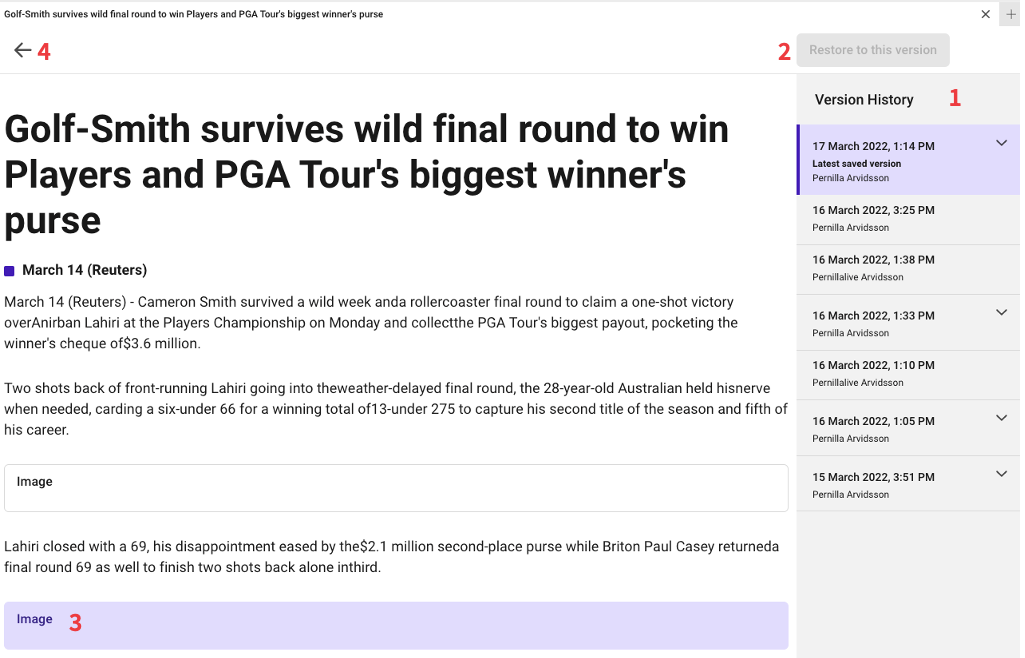 If you for some reason want to see an earlier version of an article you have a possibility to do so. You will also have the possibility to restore to an older version if you want to do so.