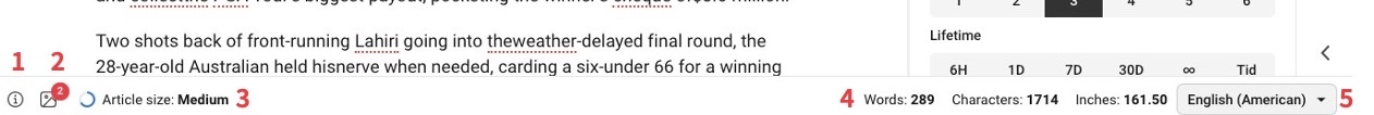 4. Information about words, characters and inches. (setting in the top bar if you want to show this or not)