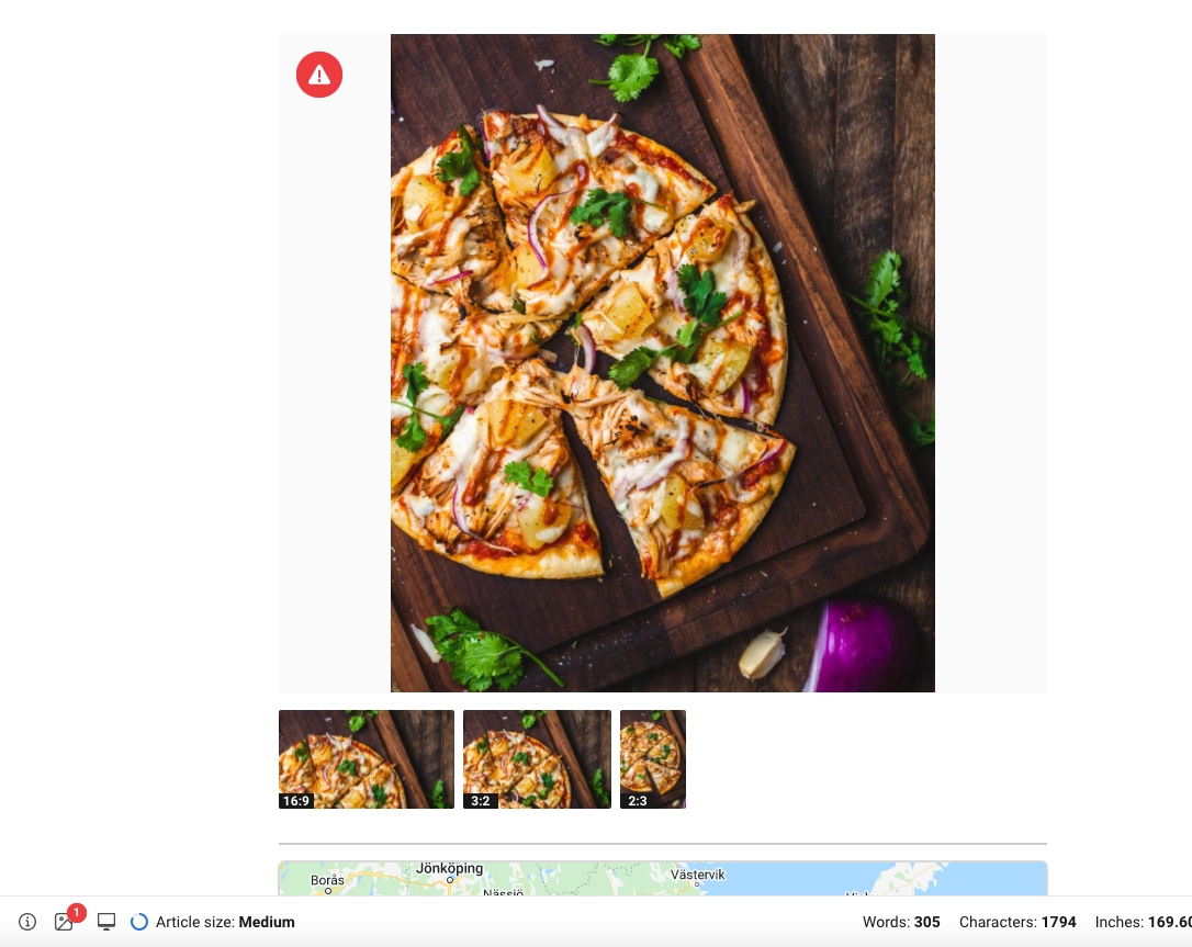 If you have metadata set on the image in Naviga Photos, this metadata is following to the article (2). If the image has instruction you see that there is an icon on the image that indicates this (2). If you hover over the icon you see the instructions.