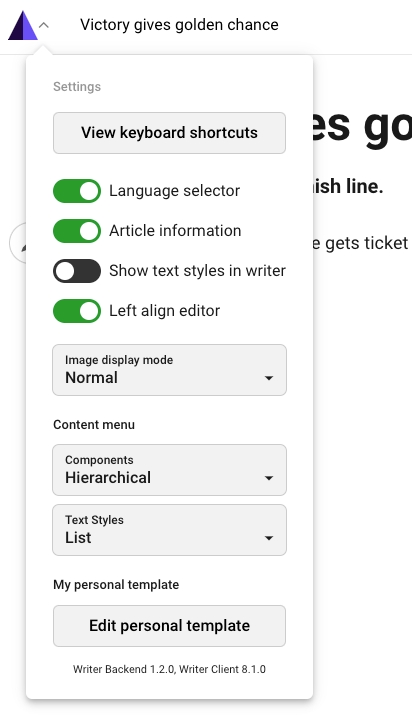 Content menu: In this setting you decide how you want the content menu to be shown for you. The content menu is the menu where you for example select text styles or chooses to add a component such as a teaser or an image gallery. You can choose to see this menu hierarchical or in a plain list